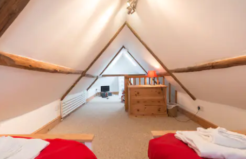 The second floor comprises the attic which has a twin bedroom and is more suited to children given the sloping eaves and beams. The beams are made from the masts of ships and there is also an area to watch TV and DVD's. Please note that the steps into the attic are very steep and should be descended backwards. They are not suitable for young children.